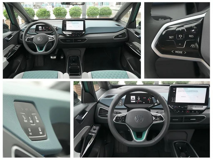 而充满科技味道的ID.3反而没那么讲究。采用浅绿色进行拼色的它,看上去确实时尚不少,但实际上,它只是在采用搪塑工艺的中控台上涂了一层颜料罢了,谈不上用料、工艺上的创新,细看之下甚至多少有些廉价。